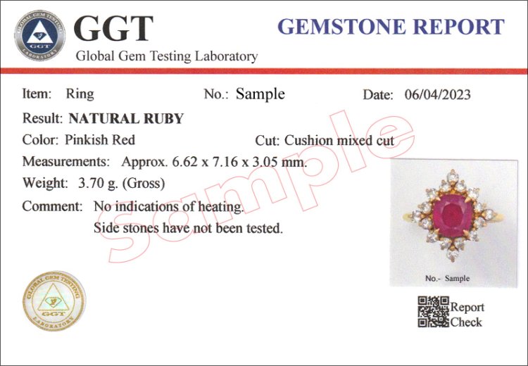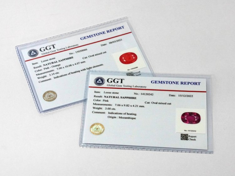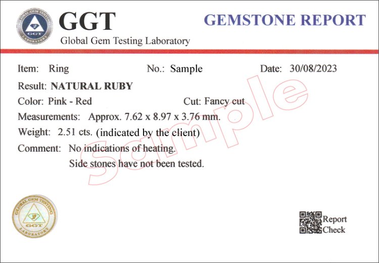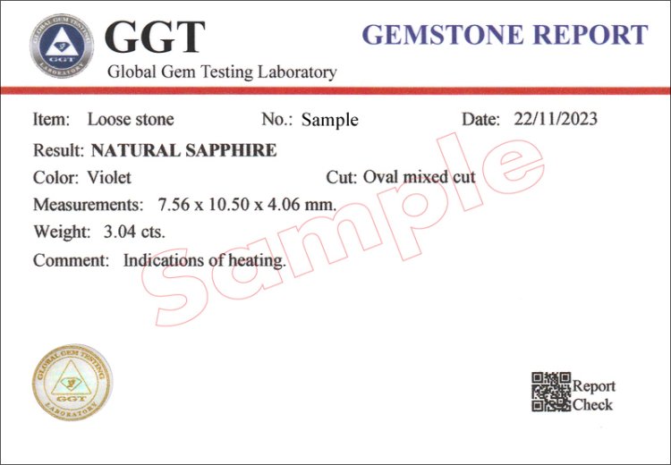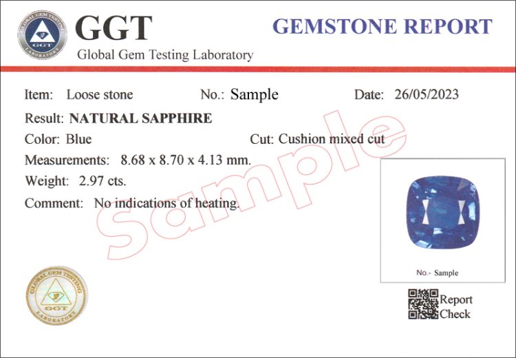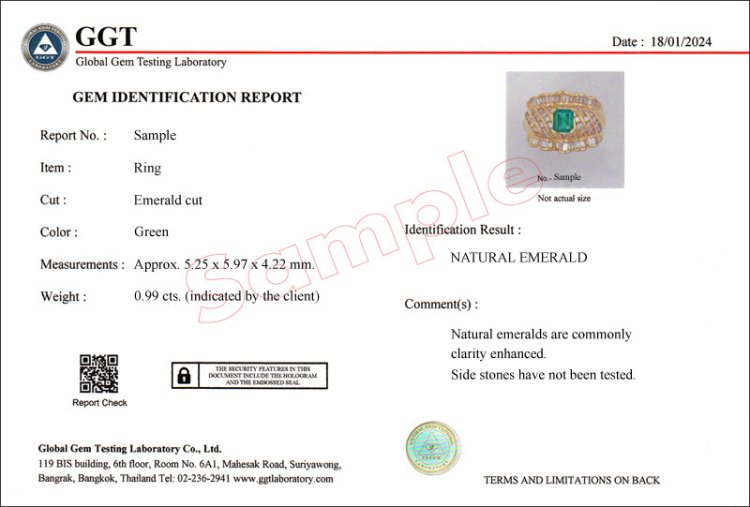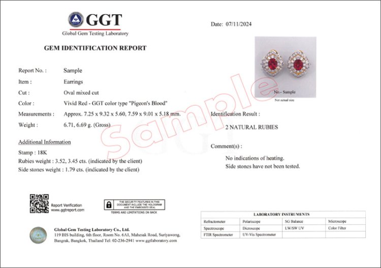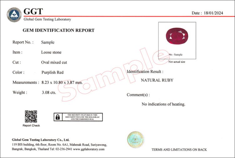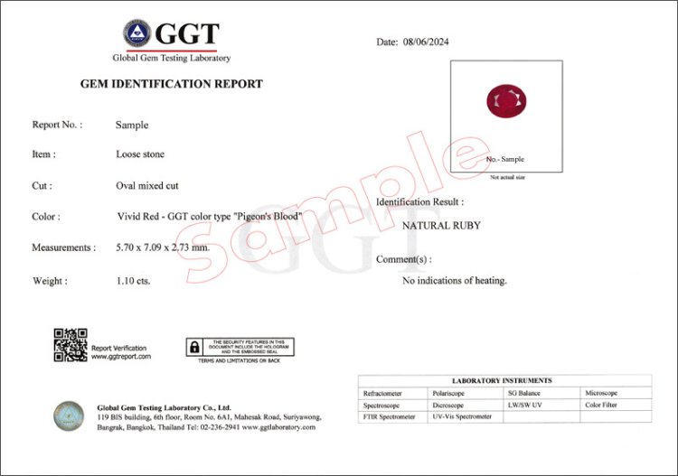 – ระบุผลการวิเคราะห์ของอัญมณี ชนิดของสีพลอยทับทิมและแซปไฟร์ เช่น ทับทิมสีเลือดนก หรือ แซปไฟร์สีรอยัลบลู พร้อมภาพถ่ายที่คมชัด